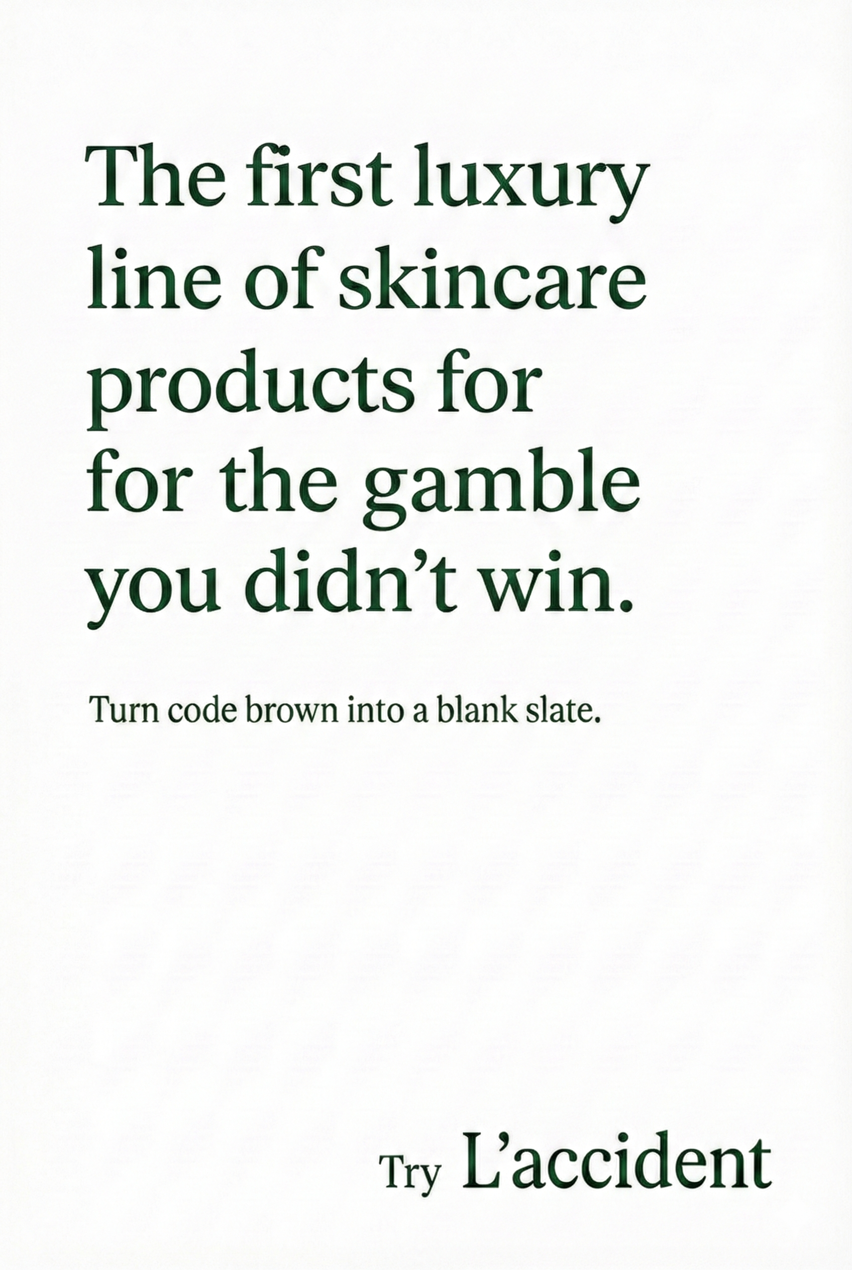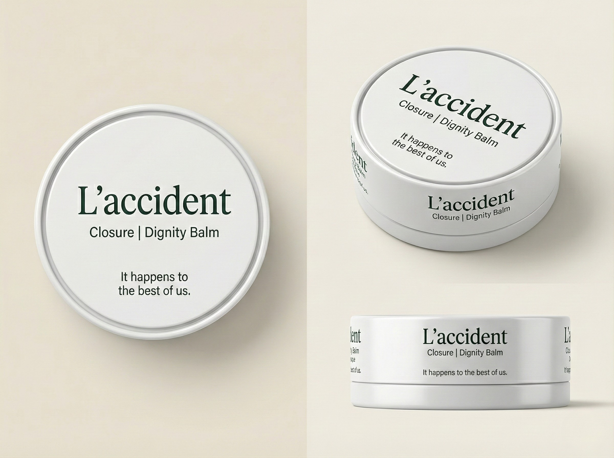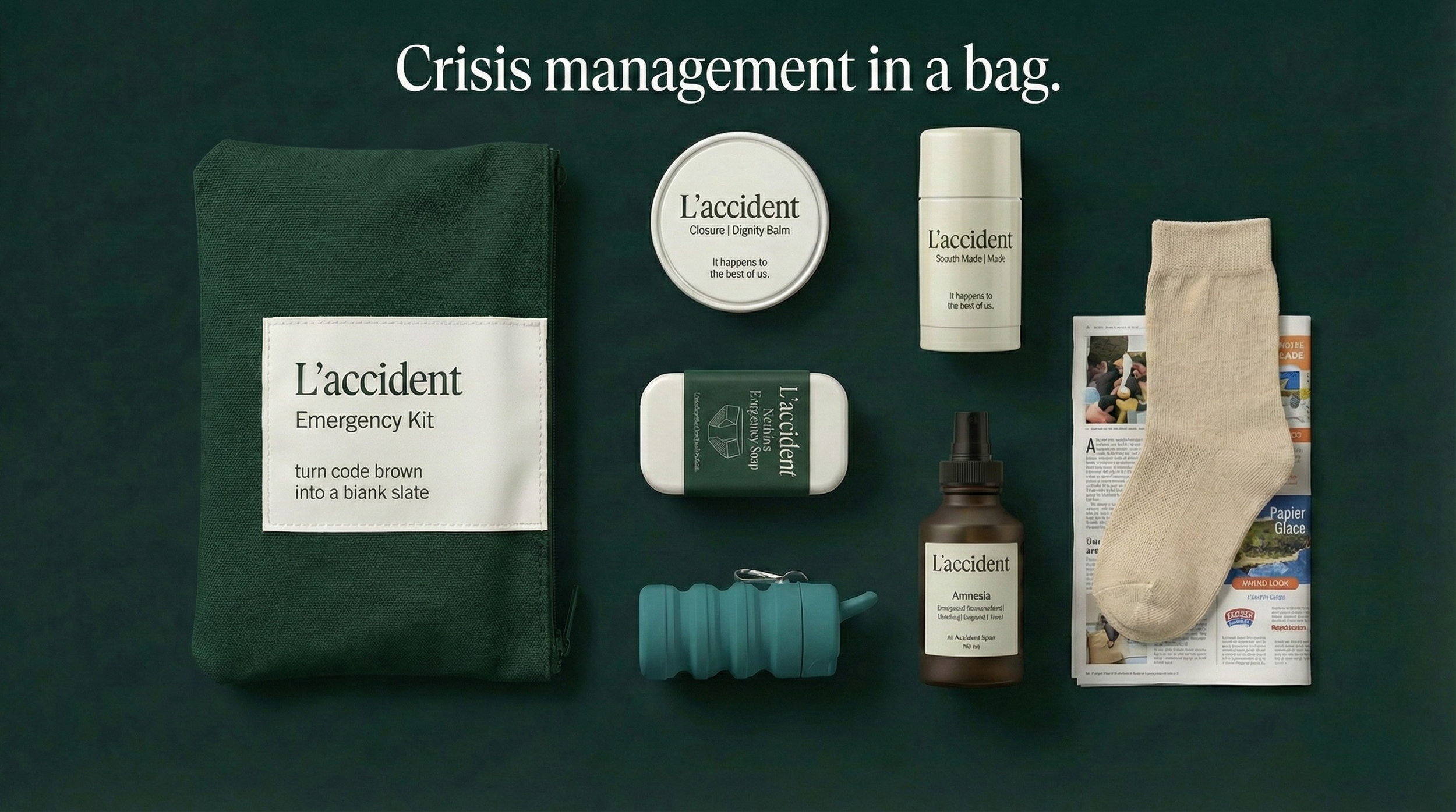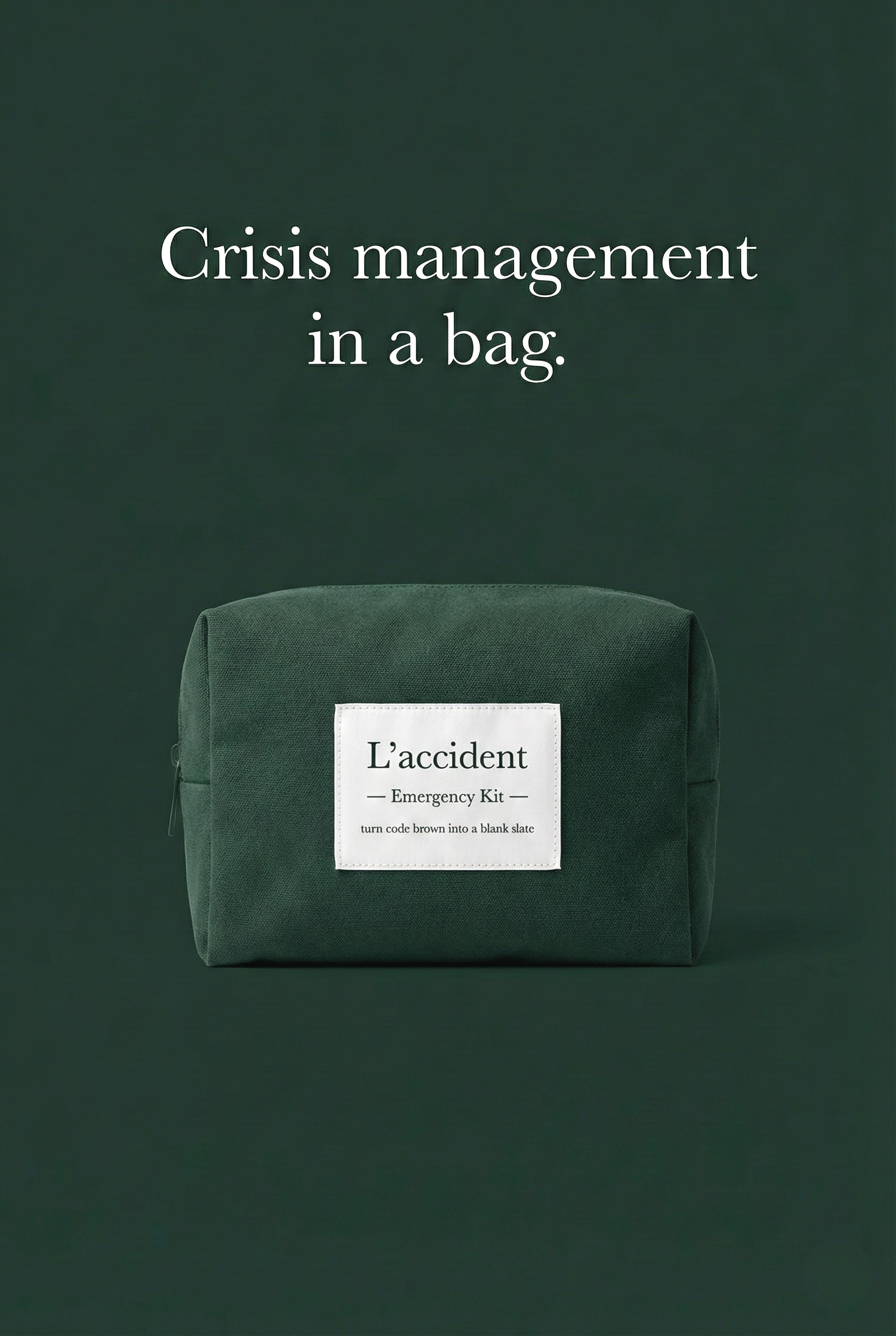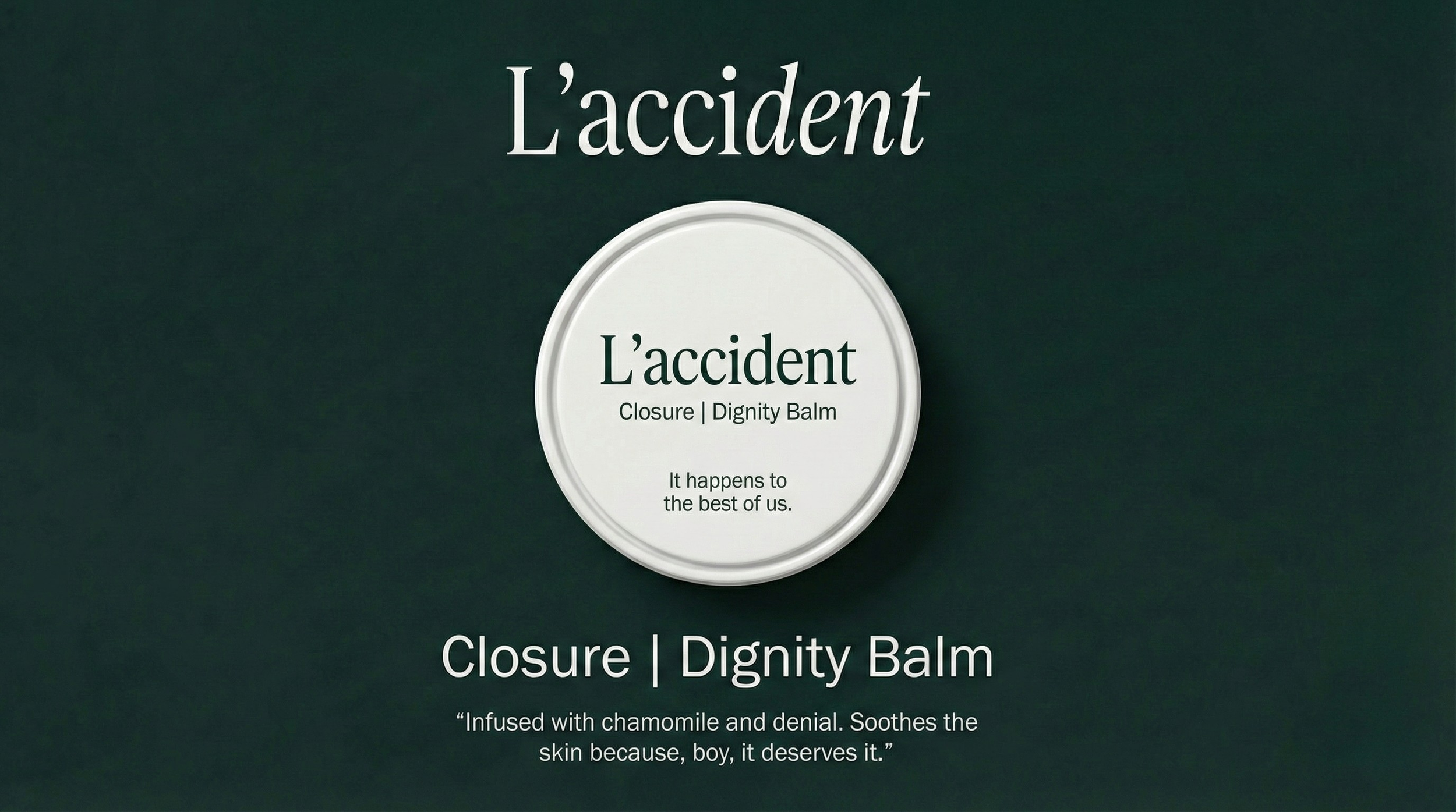 I identified a whitespace in the market. Specifically, the whitespace between "everything is fine" and "I need to go home immediately." L'accident is the first luxury skincare regimen for the unspoken aftermath of a bad day—treating the most overlooked part of the body with the reverence it rarely gets.